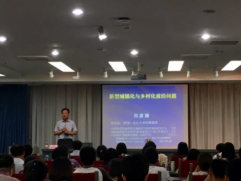 刘彦随研究员结合自己多年来乡村发展的科学实践和研究成果,深入阐述了城镇化与新型城镇化演变历程、城镇化发展问题诊断、新型城镇化转型战略,探讨了农村转型发展的理论前沿等问题。本次报告持续了两个半小时,高屋建瓴的科学思想、翔实的数据与资料,丰富的图片与案例,参加讲座的师生们均感觉收获颇丰,报告获得了在座全体师生的阵阵掌声。最后刘彦随研究员强调作为学者要有情怀、有责任和担当,鼓励大家做学术要胸怀国家战略需求、民生需要和学科发展,要做到“走出去、引进来”和“不求所有但求所用”,让在座师生受益匪浅。